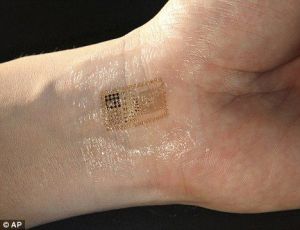 ?????? 彩繪紋身曾風靡一時,但美國圣地亞哥市加利福尼亞大學的科學家托德?科爾曼(Todd Coleman)卻發明了一種具有實用功能的紋身。這個發明被稱為Epidermal electronics(表皮電子),如同在皮膚表面彎曲、伸展的電子紋路,這種電子電路幾乎不可見,超薄電子電路的尺寸與一張郵票相當,厚度不及人的一根頭發,可利用天然靜電力粘在皮膚上,具備傳統電子裝置的功能同時不需要線路或者大量電量。它們能檢測患者的皮膚溫度、腦電波或心率,并以無線電波的方式將數據發送到醫院的計算機上。研究人員測試后發現,智能“皮膚”可在受試者上肢、頸部、前額、臉頰及下顎上工作24個小時而不刺激皮膚,該裝置測得的受試者大腿肌肉和心臟等相關活動信號,與用常規笨重電極、導電凝膠等所測得的信號吻合。