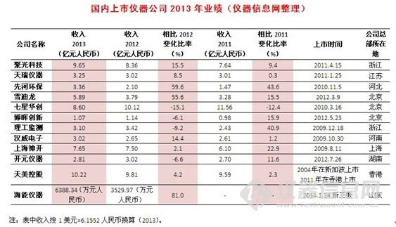2013年,國內上市儀器公司的表現喜憂參半。經儀器信息網統計,在已經上市的12家儀器公司中,以環保市場為主業的先河環保、雪迪龍實現了超50%的增長,而七星華創、博暉創新、理工監測、開元儀器出現負增長。?